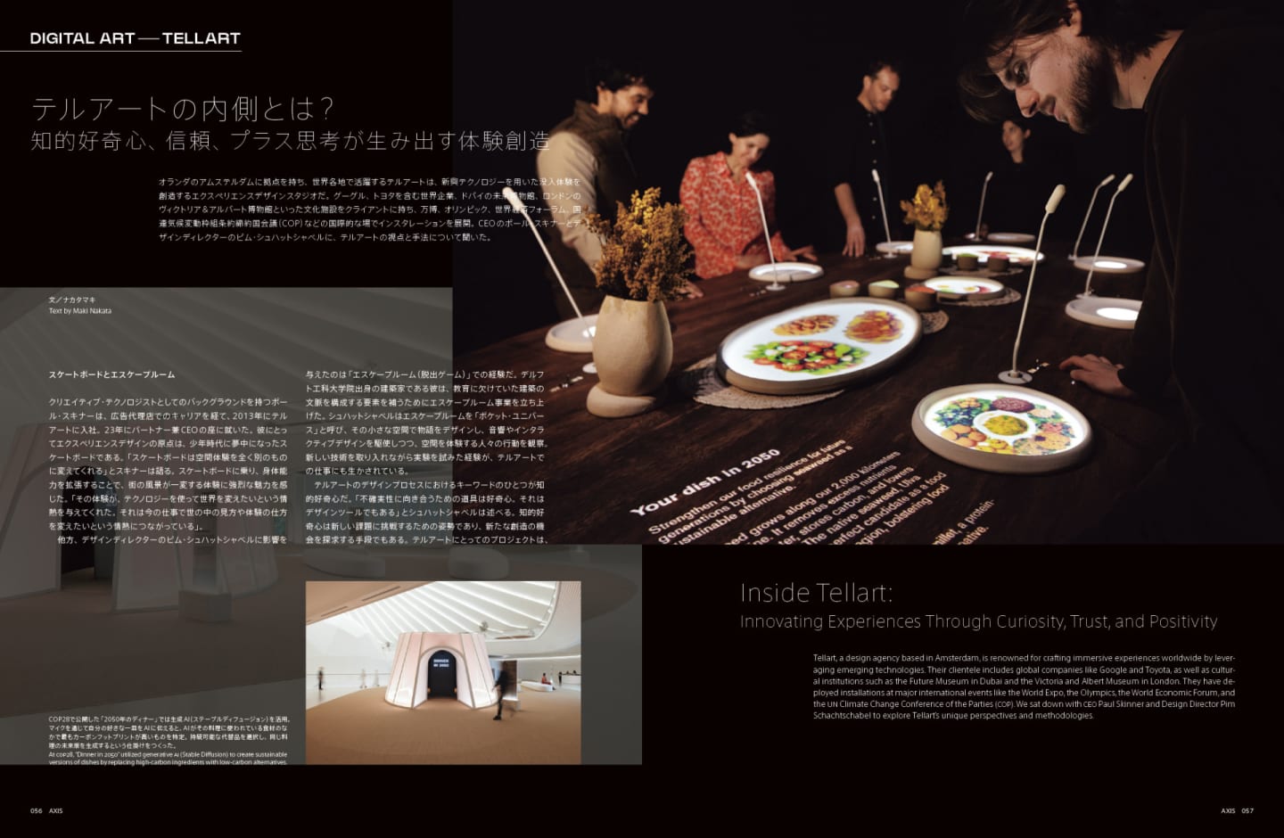 オランダのアムステルダムに拠点を持ち、世界各地で活躍するテルアートは、新興テクノロジーを用いた没入体験を創造するエクスペリエンスデザインスタジオだ。グーグル、トヨタを含む世界企業、ドバイの未来博物館、ロンドンのヴィクトリア&アルバート博物館といった文化施設をクライアントに持ち、万博、オリンピック、世界経済フォーラム、国連気候変動枠組条約締約国会議(COP)などの国際的な場でインスタレーションを展開。CEOのポール、スキナーとデザインディレクターのピム・シュハットシャベルに、テルアートの視点と手法について聞いた。