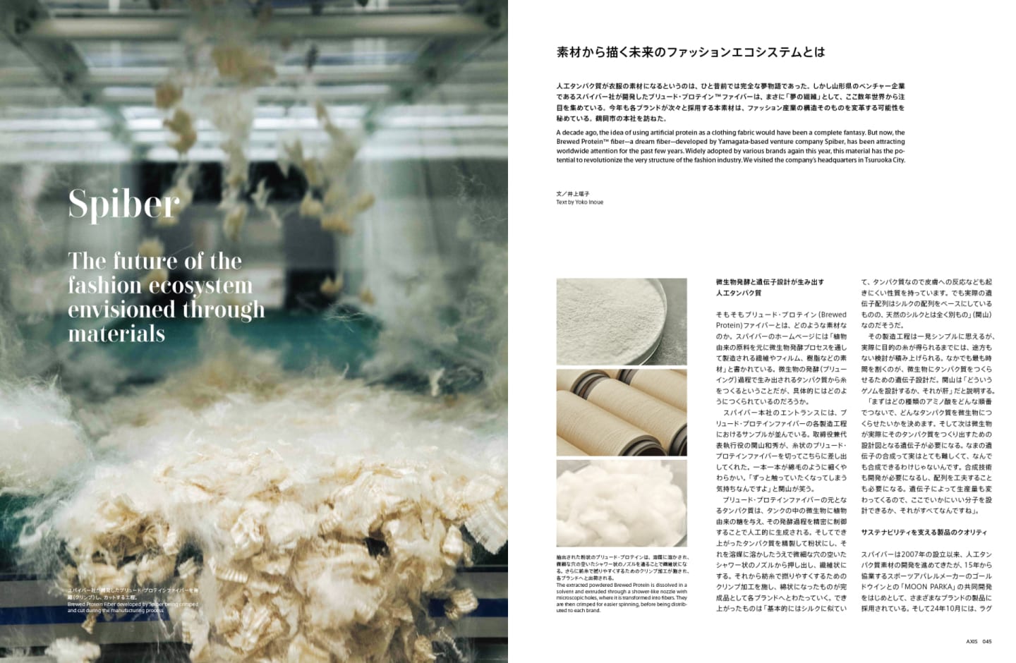 人工タンパク質が衣服の素材になるというのは、ひと昔前では完全な夢物語であった。しかし山形県のベンチャー企業であるスパイバー社が開発したブリュード・プロテイン™ファイバーは、まさに「夢の繊維」として、ここ数年世界から注目を集めている。今年も各ブランドが次々と採用する本素材は、ファッション産業の構造そのものを変革する可能性を秘めている。鶴岡市の本社を訪ねた。