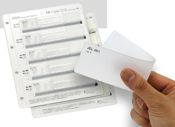 「JIDA スタンダードサンプルズ2」(本体価格38,000円)は樹脂素材と表面処理集の第2弾。「艶消しメッキ」「ハーフミラー」「メタリックモールド」「パールモールド」「樹脂(ナチュラル材)」「エラストマー」の6項目で全50種類のサンプルを収録。