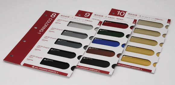 「JIDA スタンダードサンプルズ4」(本体価格42,000円)では、「シルバー」の表現を網羅。「化学的前理」「機械的前処理」「着色処理」の項目にわたって、全46種類のサンプルを収録。