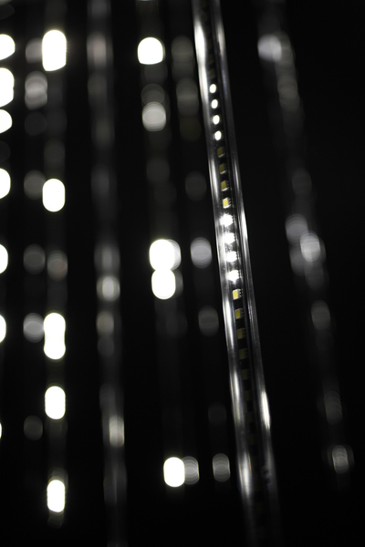 仕組みは、LEDを縦に配列した照明28本と、その光を反射させるための透明なアクリルポール50本を、天井から吊り下げている。LED照明は、カラーキネティクス・ジャパンと共同でデバイスを開発。長さ2m50cmの透明アクリルバーに白色のチップLEDが収まっており、全LEDを1灯ずつ制御することができるという。