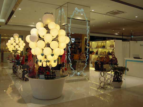 サマンサタバサ・ロッテワールド店。設計はグラマラス森田さんと大場ロイさん。象徴的な葡萄の房のようなガラスグローブ照明は、ランプの不具合がありましたが調整や交換をして問題解決へ。