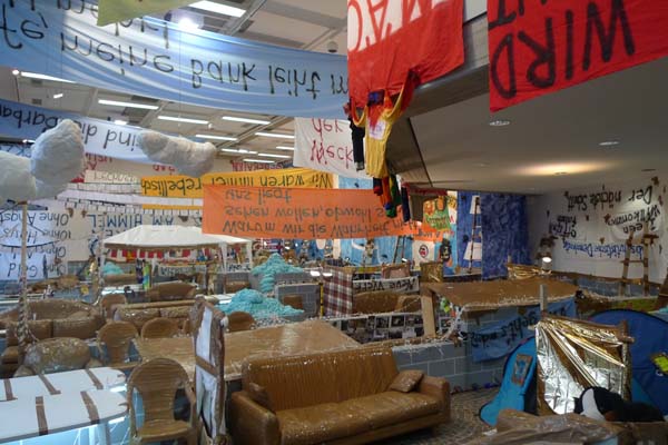 先日、オープンスペースで2011年度クルト・シュヴィッタース賞の受賞記念展として、スイス出身のトーマス・ヒルシュホルンのアナーキーなインスタレーション「低位置の制御」が行われました。展示ホールへの扉を閉め忘れたら、夜中に誰かが侵入して住み着いてしまった、という想定です。