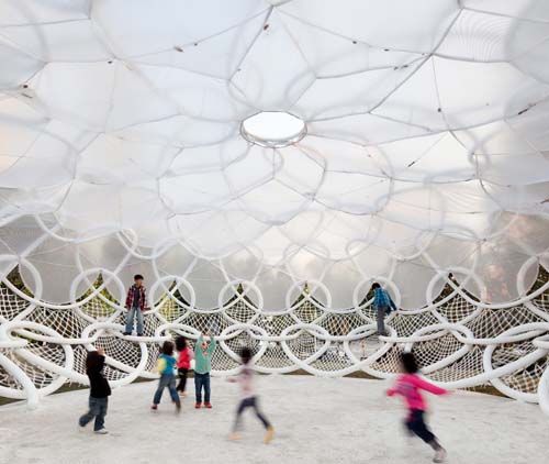 これは韓国の建築事務所Mass Studiesがデザインした、オープンパビリオン「jung-ja」。公園内に設置し、“パブリック・リビング・ルーム”のような機能を果たすことを目的としている。スチールの構造体に、屋根には巨大ドームでも使われる半透明のPVCシートを使用。直射日光と雨を遮りつつ、十分な光を採り入れ、明るく快適な空間をつくり上げた。