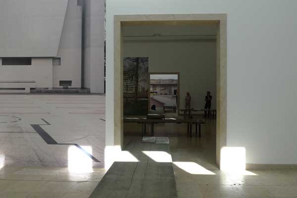 決して美しい場所とはいえないドイツ館。それをデザインで美しい場所に変容させたかった。パビリオンはとても厳格かつモニュメンタルで、歴史的にも問題がありますが、純粋な展示空間としては文句なく機能します。建築に潜在するドイツの歴史や否定的なオーラにとらわれることなく、また空間に反抗するのでもなく、あるがままの空間を利用するようにい努めました。日の差し具合で上部の光窓が壁や床に幾何学模様を描いてくれます。