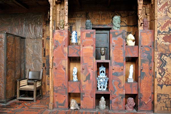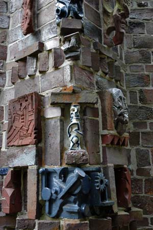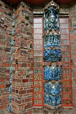 壁の煉瓦石の色合いや形態が独特ですが、オルデンブルク産のクリンカー煉瓦のアウトレットが使われています。コストが節約できるのに加え、1つ1つが違う焼成具合のため、パーフェクトな上質煉瓦なら生み出せなかったであろう仕上がりで、とても生き生きとしています。ボッサードは自分で幾何学的なフォルムの煉瓦もデザインして焼成し、市販の煉瓦の間に組み込みました。それでもまだ造形芸術的に不足だとして、さまざまな陶製の彫刻も付け加えていきましました。