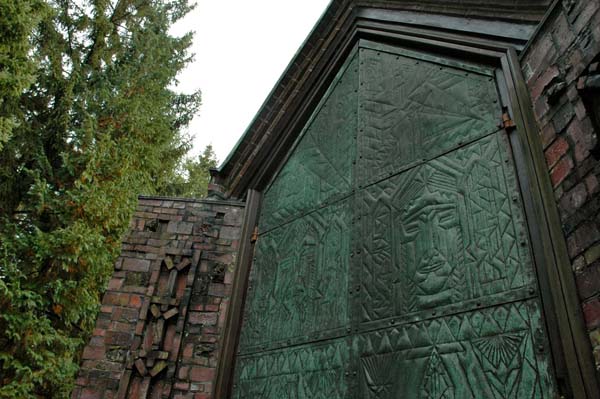 ▲「芸術神殿」の緑青の大扉は教会の扉を連想させ奥の神聖な芸術空間へと導きます。