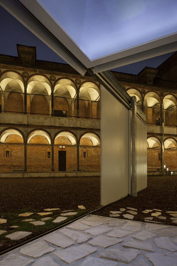 15世紀に建てられた建物の中庭に、壁が引戸のみで建つ家型のオブジェを設置。四方の引戸を開け放つと、囲い込まれていた空間(プライベートの領域が消えて、中庭のパブリックな環境)と一体となるような構造体だ。三連になった引戸をスライドさせると、周囲の景色を取り込むことができる。だから「SLIDING NATURE」。