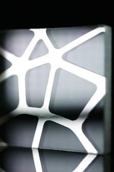 日常目にする素材と自然のモチーフからインスピレーションを受けた装飾が施された建材ガラス。合わせガラスになっており、耐薬品性も高く、あらゆる洗剤で清掃が可能。独自技術の「クロム」パターニングプロセスによって、ガラスの最表面にグラフィックパターンが施され、その後、もう1枚のガラスに接着される。抽象的なパターンが厚みのあるガラスの下に影を落とし、奥行き感を感じさせる素材。内装材として、パーティション、扉などに使用されている。