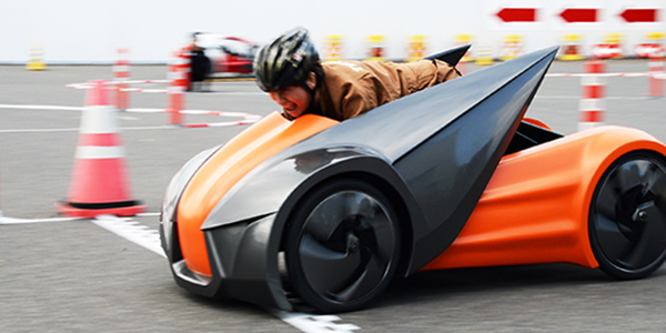 メカニカル部分では車両後方にペダルを、前方にステアリング(ステアリングバーにドライバーの肘を載せる)をレイアウト。ペダルから生み出されるパワーをチェーンを介して車体中央のシャフトに伝え、リア両輪に再伝達する構成となっています。また操舵は上半身をよじるように左右に振ることでステアするものとなっています。イメージしにくいかもしれませんが、ほぼうつ伏せになるようなポジションです。このポジションによって、車両とドライバーの視点が重なるような感覚を覚え一体感のある乗車体験が得られます。
