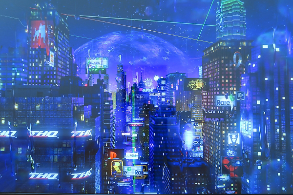 世界中に実在する超高層ビルやゲームメーカーのロゴを無数に合成した近未来の都市風景