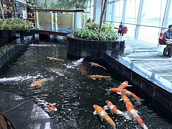 さて、チャンギ空港はミニ植物園に限らず、自然を感じさせる存在を施設内に取り込むことに熱心であるように感じる。その印象は、シンガポール航空が発着するA搭乗口に向かう途中にあるウェイティングエリアに設けられた鯉の池を見たときに、いっそう強くなった。