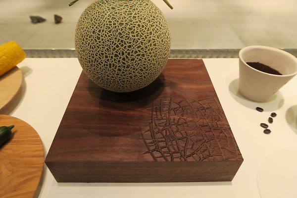 「二次元のモニターで見て満足する人もいるが、人間の感覚で一番先に発達するといわれる触感を見直すことは大事ではないか」と話す秋山かおり氏。今回は、3Dソフト「ライノセラス」のプラグインを使って、メロンやキュウリといった植物のテクスチャをシミュレーションし、木のプレート上に切削加工して表現するプロジェクトに挑んだ。「スキャナーには頼らず、どういったアルゴリズムを組めばより本物らしさを感じられるかをシミュレーションしながら自分なりにテクスチャのデータをつくっていった」という。