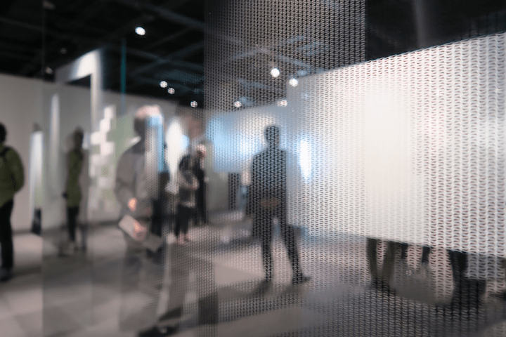 ▲ 金属メッシュのフィルムを貼ったパネルの前に立つと、向かい合わせの人の顔が映り込んで不思議な感覚に。
