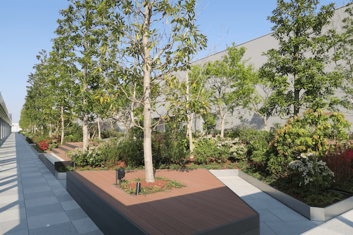 ▲4,000㎡の屋上庭園「GINZA SIXガーデン」は「江戸の庭園文化」がテーマ。ランドスケープアーキテクトの宮城俊作がセレクトしたのは「日本初の街路樹」と言われる桜やカエデ、松といった20種類以上のすべて在来種の低木。大きな水盤は水の音が涼感を誘い、イベントに応じて水を止めることも可能。