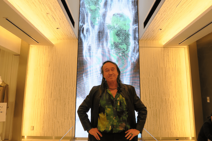 ▲植物学者でありアーティストのパトリック・ブランによるバーチカルガーデン「リビングキャニオン」。「日本の自生種を含めて75種類の植物を組み合わせた。花の色のグラデーションを楽しんでほしい」。ちなみにチームラボの「リビングウォール」の映像内には、パトリック・ブランがセレクトした植物が描かれている。