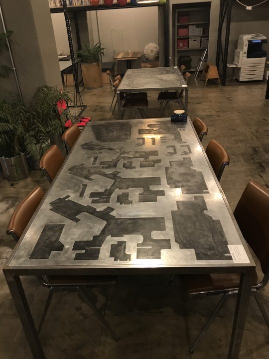 ▲型抜き板の展示と、それを使用したプロトタイプ。インダストリアルな雰囲気が単純に格好いい。