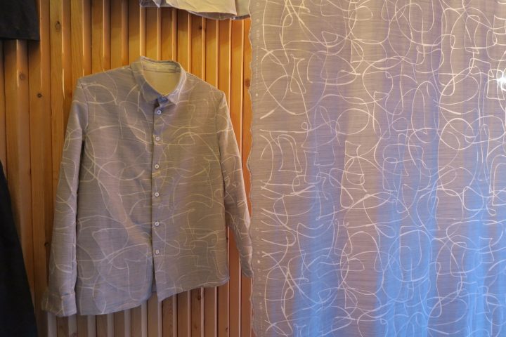 会場では、これらのテキスタイルを使ってパタンナーの廣瀬が制作したシャツやパンツ、クッションカバーなどの最終製品を展示しているが、用途が決まっているわけではない。「“おいしい素材”として提供して、ものをつくる人には自由に料理してもらいたい」(シミズダニ)。