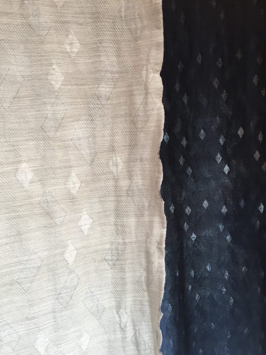 もうひとつの「kiri」は片面がコットン、片面がウールという質感の違いを楽しめる作品。ウールだけを薬剤で溶かすというプリント技法により、柄の一部が霧のように透けて見える。「天然素材にはあまり用いない技術で、協力を依頼したプリント工場「相和プリント」でも30年ぶりに使ったそうです」(近藤)。どちらの作品も技術的に難しく、かなり試行錯誤したようだ。