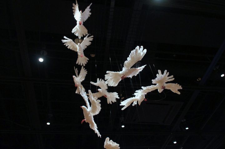 ▲羽は1枚ずつ手で切り込みを入れ、全部で1,000枚ほどつくったと話す佐藤さん。鳩1羽につき70〜80枚の羽がついている
