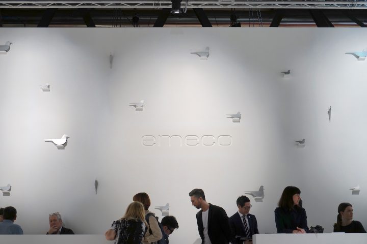 エメコのスタンド壁面を飾ったのは、アルミニウム製の鳥。ハト、スズメ、ツグミ、カラスをかたどったオブジェは、ジャスパー・モリソンの教え子だったユン・リーが自主制作をプレゼントしたことをきっかけにエメコの目に止まり、製品化されることになった。アルミニウムの成形、曲げ、陽極酸化による加工といった、エメコのものづくりが反映されている点でも新作にふさわしいと評価されたという。それぞれの鳥はほかのコレクション同様、ロゴが刻印されている。