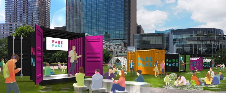 組み立てるとテーブルや椅子になるツールなどがコンテナに収納された「PARK PACK」。芝生広場が「PARK PACK」によって遊び場やシネマに変化する。楽しく遊びながら「みらいの公園」について考える、実験的なイベントになりそうだ。![]()