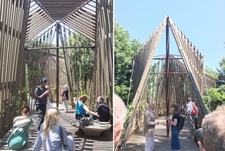 何とは無しにセドリック・プライスによるロンドン動物園の「鳥かご」も想起させる、スチールと木の架構による軽快な憩いの空間。林立する十字のスチール構造体がチャペルを想起させる。