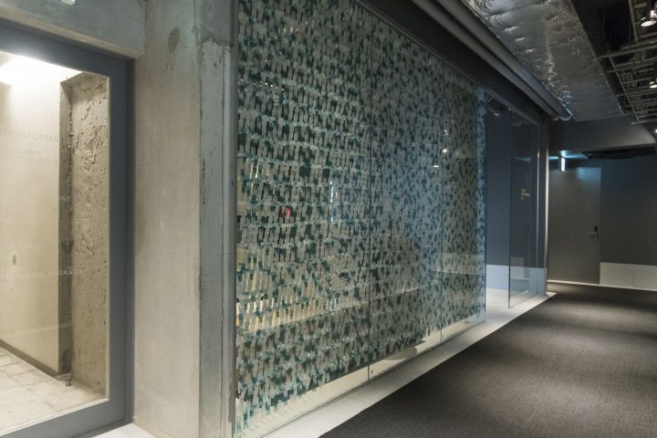 ▲広島県生まれの高本敦基氏の作品は洗濯バサミを用いたインスタレーションだ。ランドリールームの「The Fall」という壁面は、この場で制作されたもの。