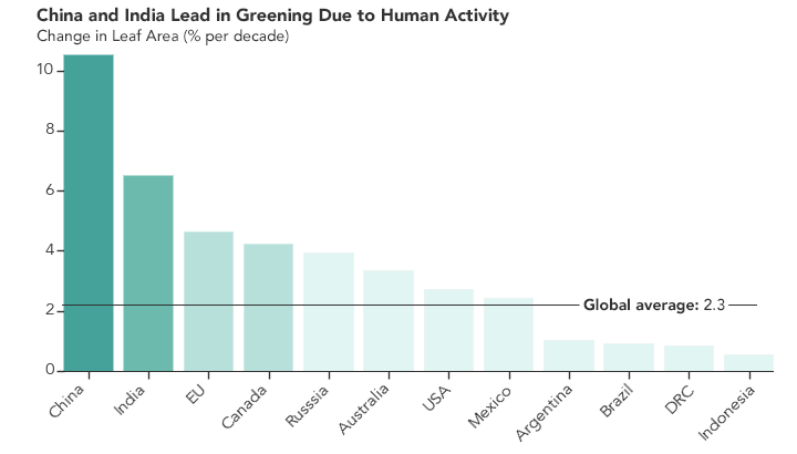 こうした世界的な緑化傾向には中国が多大な貢献をしている。同国ではたとえば、土壌の侵食、大気汚染、気候変動の影響を減らす森林の保全・拡大プログラムを実施している。また、インドでは、食用作物の集約栽培によるものが大きい。