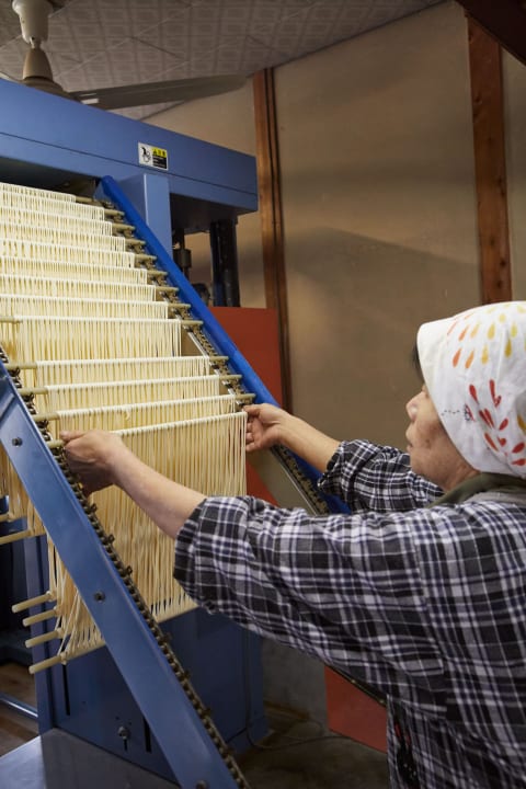 ▲麺をハタと呼ばれる器具に掛けていく「ハタづけ」の工程。150㎝ほどに伸びた麺を職人が足元まで引き伸ばし、最終的には約2mの長さに仕上げる。ハタづけされた麺は繊細なヴェールのような、はたまた天女の羽衣のような美しさ。