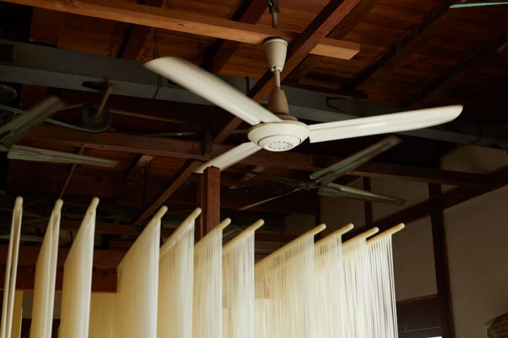 島内には実に約150軒もの製麺所があり、その中でも伝統的な「手延べ」による素麺づくりを真摯に続ける「真砂喜之助製麺所」を訪ねた。1920年代に創業したこちらは、2代目の喜之助氏が製法を確立し、現在は3代目と4代目がその味を受け継ぐ家族経営の製麺所だ。あいにくの雨続きだった取材時、「明日は晴れそうなので天日干しをしますよ」と4代目の真砂淳さんが声をかけてくださったので伺うと、まさに作業の真っ最中。幅1mmほどに細く伸ばされた麺が朝日に透けて、まるで絹糸のように美しい。