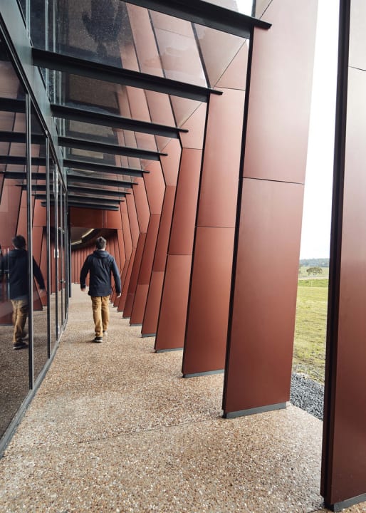 牛舎には、典型的なオーストラリアの牛小屋の外観から始まって、伝統的な切妻のある納屋に変わり、最後には搾乳施設へと至る流れを作っている。ファサードは通路に沿ってねじれたデザインで、ダイナミックな高さを生み出しつつ、工程の諸段階に合わせている。抗酸化加工を施した赤いパネルは、一日を通して建物の外観を濃い赤から紫、そして鮮やかな金色に変わっていくそうだ。End