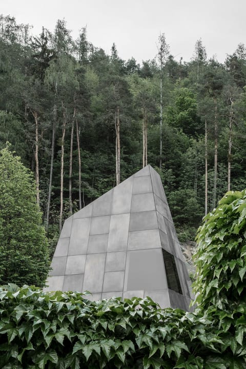 敷地の一番高いところには、ブロンズパネルで覆った採光孔のあり多角形のタワーが周囲にそびえる山の頂のように出現。上階はオフィスとテイスティングルームになっており、下の階にはブドウ収穫機を格納している。