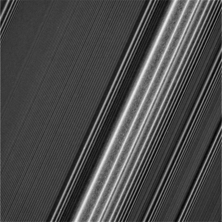そして、クローズアップ画像がとらえた詰まった部分、滑らかな部分、縞状の部分という3つのテクスチャは、はっきりした境界のある帯状のものとして発生することはわかったが、その原因はわからない。というのも、これまでに知られている環のどんな特徴とも関係がないからだ。