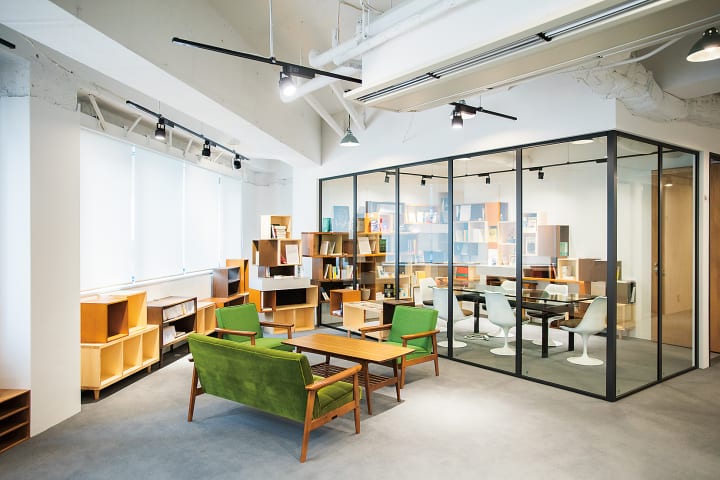 ▲国内外・多ジャンルからなる情報誌が集められた「NEWS STAND」や、靴を脱いであがるフリースペースなど、社員同士が気軽にコミュニケーションをとれるオフィス環境になっている。©井上佐由紀/Sayuki Inoue