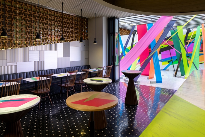 マテリアルは、最長60cm幅の色とりどりの和紙テープとコンクリートスティック。街のネオンや自然の植物、光や闇など、さまざまな記憶を「残像」として色に宿したテープが、天井からフロアへと無造作に置かれたコンクリートスティックの間を渡り、空中に浮いたテープが空間を彩る。