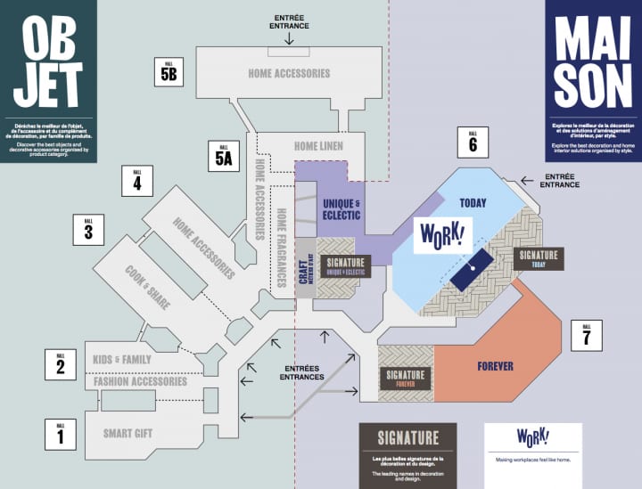 製品カテゴリー別の7エリアから成る「OBJET」は、小売・流通関係者のために。装飾のスタイル別に分けられた4エリアから成る「MAISON」は、空間デザイナーやインテリアデザイナー、建築家のために構成されている。