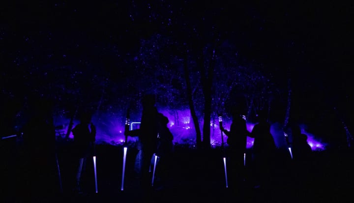 舞台となる夜の森の中には、プロジェクションマッピングやシノグラフィー(光と音の舞台装置)、リズムスティックと連動したインタラクティブな仕掛けなどが多数展開される。