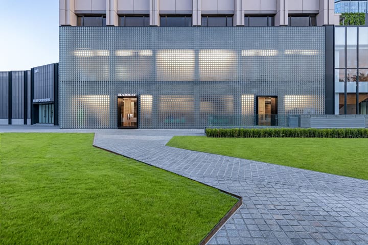 次のデザイン要素は、エントランスエリアの横に作られた「スツールウォール」。壁にスツールをたくさん埋め込んだクリエイティブな収納だ。会議や来客時には簡単に引き出して使うことができる。形状は「B」になっており、DDBのロゴにあるカラーが使われている。