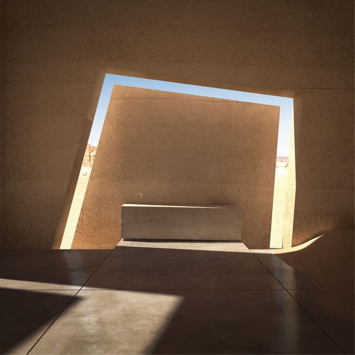Christophe Benichou Architectureが公開したプロジェクト「Sesame」は、砂漠にぽつんと立つモノリシックな建築だ。