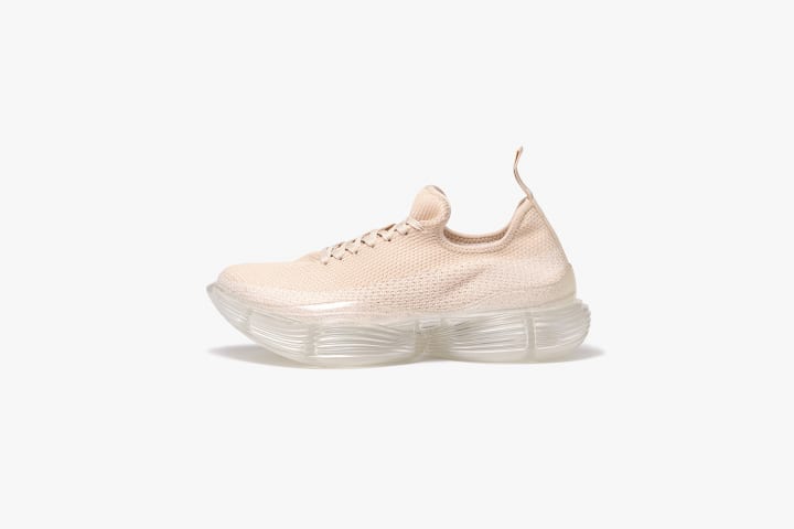 とくに特徴的なのはソールの形状だ。軽さを追求して重力を忘れさせるのではなく、ソールを歩き出しに適したシェイプにすることや、透明度の高いソールで身体そのものが浮いたような感覚にすることを目指しているという。