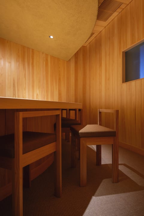 素材はカウンターのイチョウをメインに、土壁やヒノキなど落ち着きある同系色で構成。老朽化した屋根はガルバリウム鋼板で葺き替え、外壁はグレーのスタッコで仕上げた。外観は夜景の中に静かに溶け込ませながら、内部は単一の世界観を明快に感じられるような空間に仕上がっている。![]()