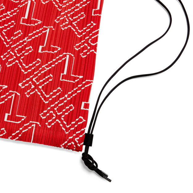 このナップサックは、「プリーツ プリーズ イッセイ ミヤケ」でおなじみのプリーツを用い、MoMAのロゴをカタカナに置き換えたグラフィックのパターンをデザインしている。