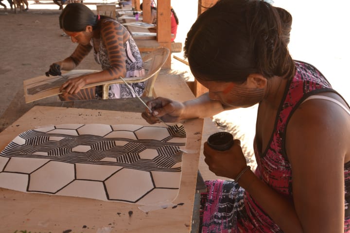 模様の描き入れは女性の役割と決まっており、ボディーペインティングや布地への描き入れが日常的に行われているため、カヤポ族の女性は常に片手が黒くインクに染められている。