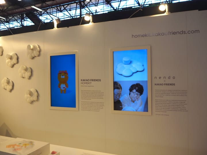 2箇所目はアプリ「カカオトーク」で有名な韓国のインターネットサービス会社 「カカオ」のブース。展示会開催と同時期に発表されたIoT家電コレクション「Kakao Friends HomeKit」のデザインをnendoは手がけている。加湿器、照明、目覚まし時計、空気清浄機、センサー、体重計、温度計の7種類にはそれぞれの機能を端的かつチャーミングに表したアイコンがそのまま形状として施されている。カカオ社の人気キャラクター「カカオフレンズ」と合わせて楽しむこともできる、テクノロジーを前に出しすぎない、親しみやすさの演出は、ライフスタイル展との親和性が高いデザインとも言えるだろう。