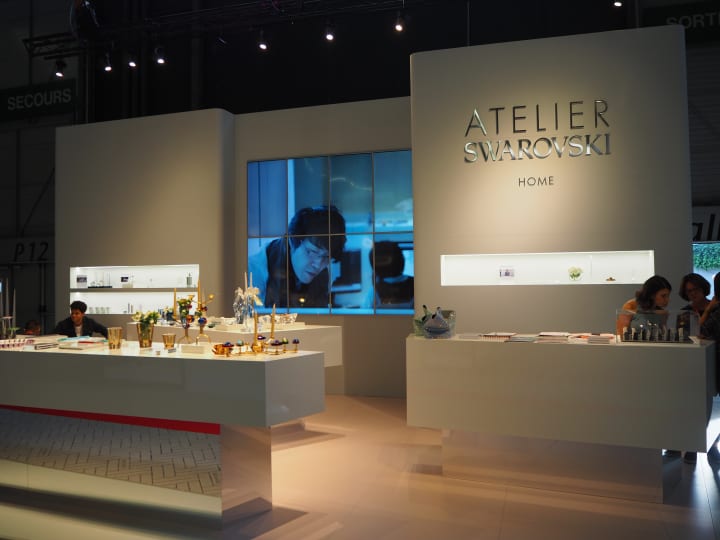 1箇所目は「スワロフスキー」。1月に発表されたコラボレーションアイテム、「Atelier Swarovski Home」シリーズの「soft pond」が展示されていた。世界的なクラスタルブランドだけあり、そのブースも豪華で大規模だ。