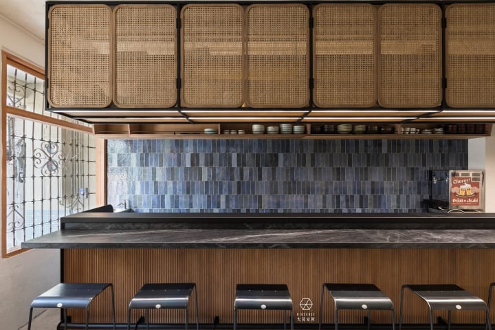 店内は、グレーのコンクリートと3トーンのテラゾ床、木製の窓、籐製の家具、黒い鉄材、青いタイルなどが、食事の空間をより居心地よく楽しげなものとしている。