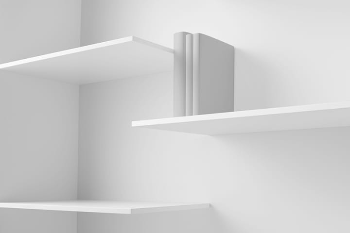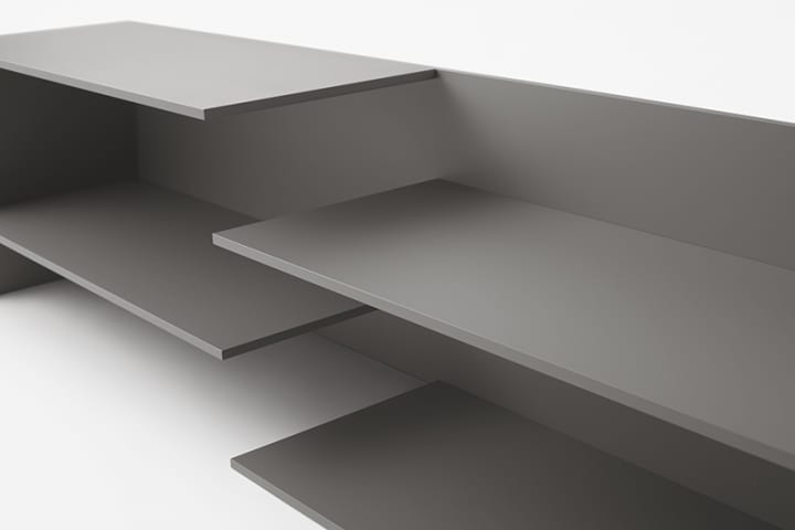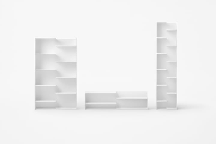 単純な四角い本棚を中央で分割し、垂直方向に「ずらした」ような形状をしたシェルフのコレクション。棚の端部がブックエンドとしての役割を果たすだけでなく、従来の棚にありがちな強い水平性がもつ緊張感を和らげている。