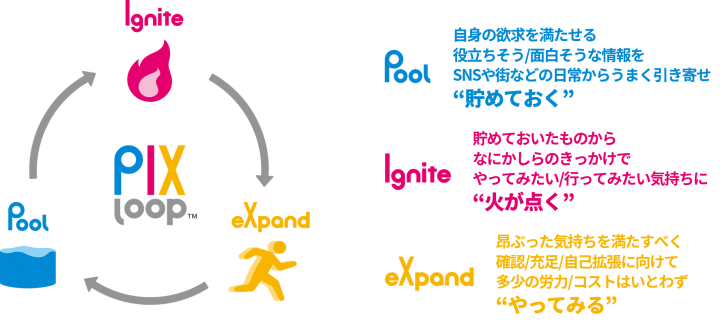 情報をプールする生活者が「情報行動」と「消費行動」を明確に区別していないことから、「Pool(情報を引き寄せ貯めておく)」→「Ignite(気持ちに火が点く)」→「eXpand(体験をやってみて情報圏を拡げる)」という行動をループさせながら自己充足を図っていることを発見し、「PIXループ™」が誕生した。
