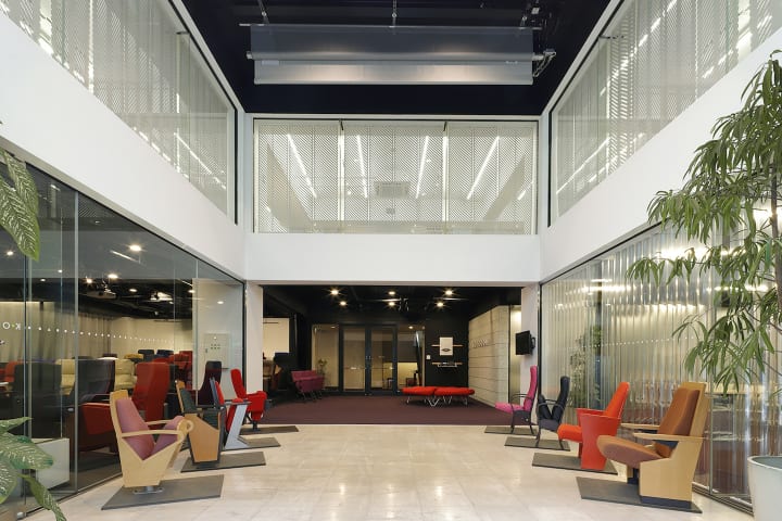 ▲ショールームは、各階で劇場・ホール、エントランス、シネマ、教育施設、スポーツ施設、スリープカプセル、議場の椅子が体感できるほか、歴代の椅子が並ぶコーナーもある。事前予約制。